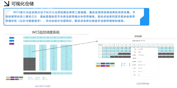 可視化:系統(tǒng)展示倉庫平面視圖,實(shí)時(shí)展示倉庫貨位變化和設(shè)備運(yùn)行狀態(tài)。